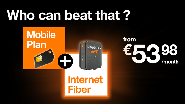 Enjoy simplified management with a single bill for your services, a dedicated advisor for all your requests, and savings of up to €10/month on your mobile plan. Plus, benefit from a reliable and high-performance Fiber connection thanks to Orange's Livebox Fiber technology, offering speeds of up to 8.5 Gbit/s.